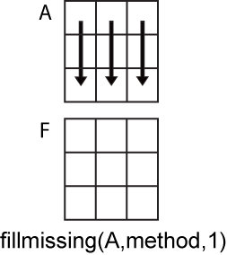 Если dim=1, то fillmissing заполняется A столбец за столбцом.