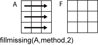 Если dim=2, то fillmissing заполняется A строка за строкой.