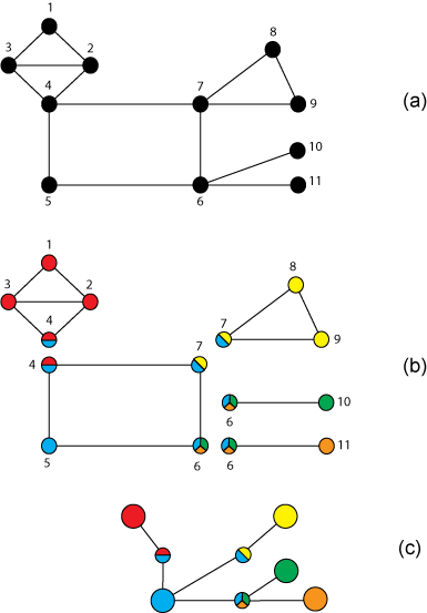 (c) Дерево блока-выреза графа, которое содержит узел для каждого двухсвязного компонента (как большие окружности) и узел для каждой вершины выреза (как меньшие разноцветные окружности). В дереве выреза блока каждая вершина выреза соединяется с каждым компонентом, которому она принадлежит.