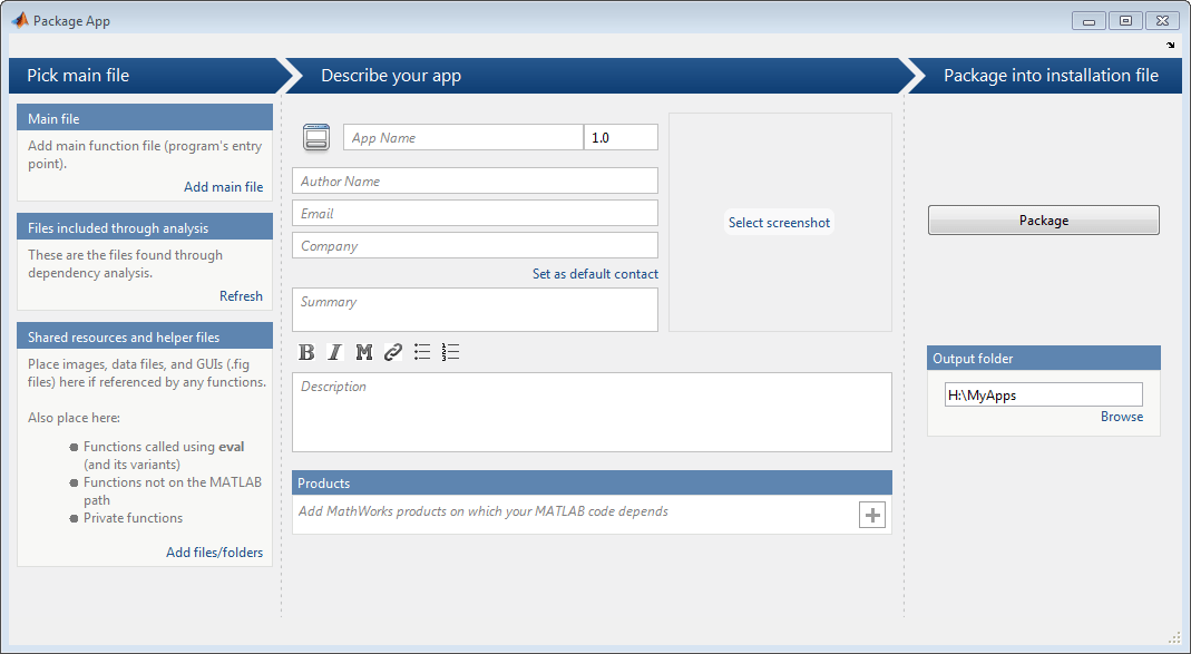 Как минимум, добавьте основной файл, укажите имя приложения и укажите требуемые продукты. MATLAB ® создает и постоянно сохраняет .prj независимо от того, нажата ли кнопка Пакет (Package). Однако MATLAB не создает .mlappinstall если не щелкнуть Пакет (Package).