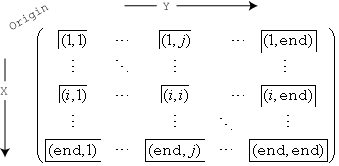 Например, (1,1) содержит значения, которые попадают на первую кромку в каждом измерении. Последняя ячейка в правом нижнем углу содержит значения, которые попадают на любую из ее кромок.