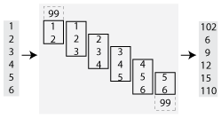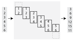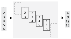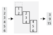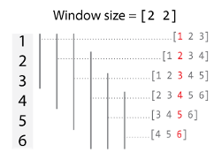 Если значение 'Stride' является 2затем вычисление изменяется таким образом, что каждое окно центрируется на каждом втором элементе на входе (1, 3, 5). Движущаяся сумма теперь возвращает три частичные суммы, а не шесть: