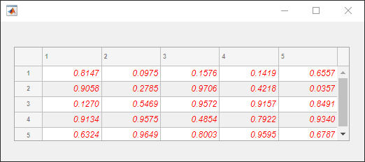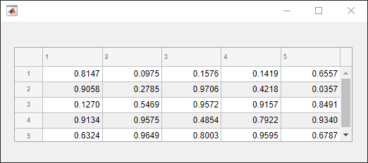fig = uifigure; fig.Position = [500 500 520 200]; uit = uitable(fig); uit.Data = rand(5); uit.Position = [20 30 480 135];
