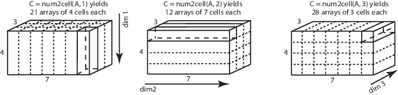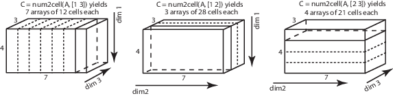 разделяет содержимое C = num2cell(A,dim)A в отдельные ячейки C, где dim указывает, какие размеры A для включения в каждую ячейку. dim может быть скаляром или вектором размеров. Например, если A имеет 2 строки и 3 столбца, затем: