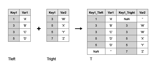 Если оба Tleft и Tright являются таблицами, но вы не указываете ни одно из имен строк входной таблицы в качестве ключа, то outerjoin не создает имена строк в T.