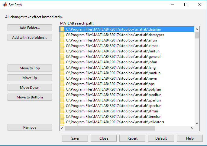 pathtool открывает диалоговое окно Задать путь (Set Path). Диалоговое окно Задать путь (Set Path) можно использовать для просмотра, изменения и сохранения пути поиска MATLAB ®.