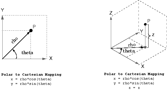 Отображение полярных и цилиндрических координат на декартовы координаты: