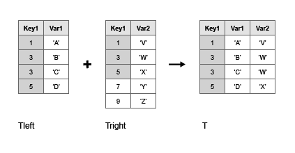 join функция сначала находит одну или несколько ключевых переменных. Затем, join использует ключевые переменные для поиска строки во входной таблице Tright который соответствует каждой строке во входной таблице Tleftи объединяет эти строки для создания строки в выходной таблице T.