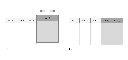 Если переменная в T1 имеет несколько столбцов, затем splitvars делает уникальные имена для новых переменных в T2 от имени исходной переменной в T1.