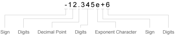 | Прочитайте один знак, если он существует. | Прочитайте одну или несколько цифр. | Считывайте одну десятичную точку, если она существует. | Если есть десятичная точка, прочитайте одну или несколько цифр, которые сразу следуют за ней. | Прочитайте один символ экспоненты, если он существует. | При наличии символа экспоненты прочитайте один символ знака. | При наличии символа экспоненты прочитайте одну или несколько цифр, следующих за ним. |
