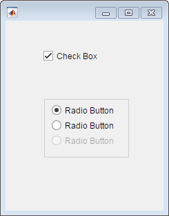 function disableRadioButton % Create a figure window: fig = uifigure('Position',[100 100 229 276]); % Create a button group and radio buttons: bg = uibuttongroup('Parent',fig,... 'Position',[56 77 123 85]); rb1 = uiradiobutton(bg,'Position',[10 60 91 15]); rb2 = uiradiobutton(bg,'Position',[10 38 91 15]); rb3 = uiradiobutton(bg,'Position',[10 16 91 15]); % Create a check box: cbx = uicheckbox(fig,'Position',[55 217 102 15],... 'ValueChangedFcn',@(cbx,event) cBoxChanged(cbx,rb3)); end % Create the function for the ValueChangedFcn callback: function cBoxChanged(cbx,rb3) val = cbx.Value; if val rb3.Enable = 'off'; else rb3.Enable = 'on'; end end