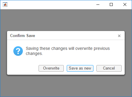fig = uifigure; msg = 'Saving these changes will overwrite previous changes.'; title = 'Confirm Save'; selection = uiconfirm(fig,msg,title,... 'Options',{'Overwrite','Save as new','Cancel'},... 'DefaultOption',2,'CancelOption',3);
