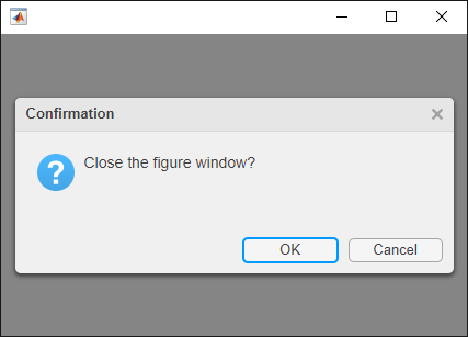 function closeFig fig = uifigure('Position',[100 100 425 275]); fig.CloseRequestFcn = @(fig,event)my_closereq(fig); function my_closereq(fig,selection) selection = uiconfirm(fig,'Close the figure window?',... 'Confirmation'); switch selection case 'OK' delete(fig) case 'Cancel' return end end end