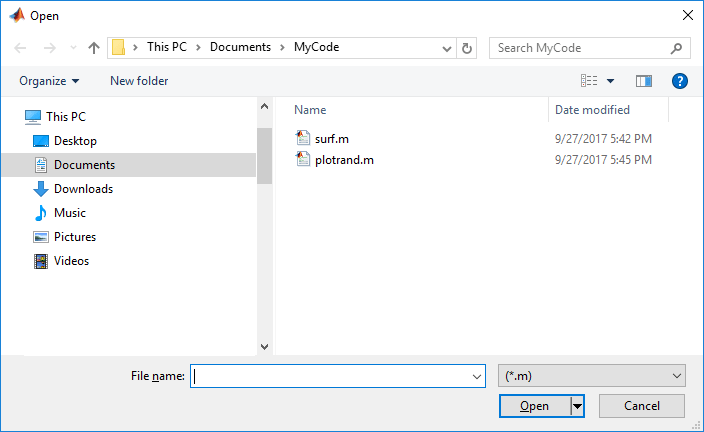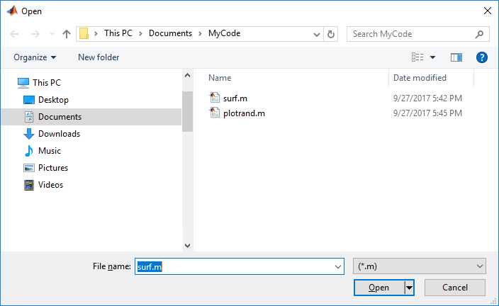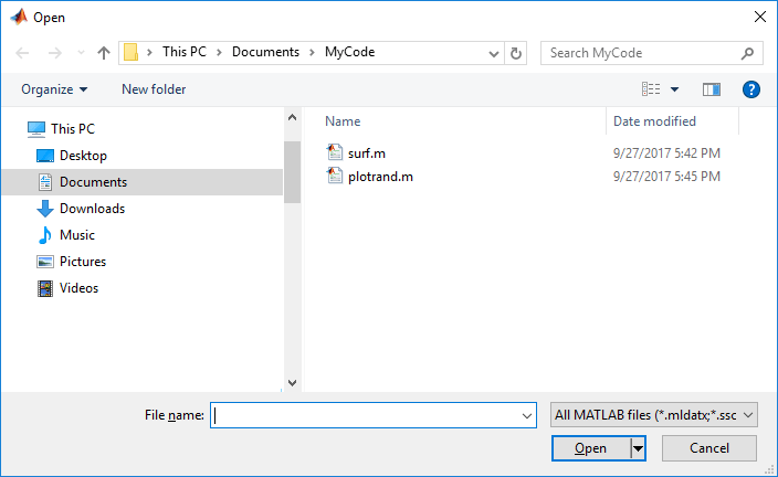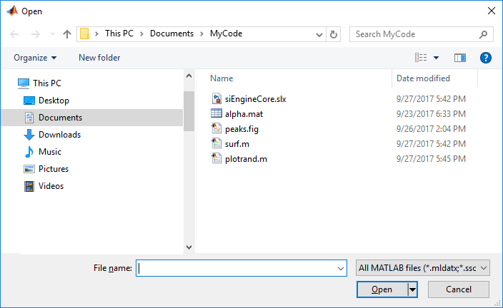 Эти функции также можно использовать для открытия файла в кодовом файле MATLAB или в команде.