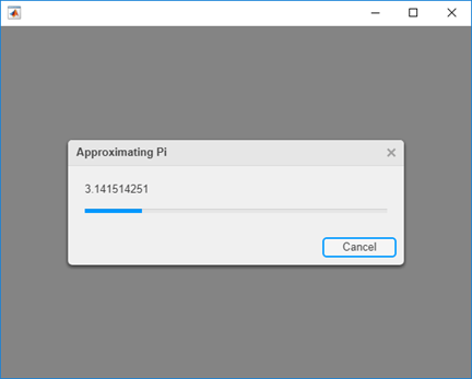function myprogress3 fig = uifigure; d = uiprogressdlg(fig,'Title','Approximating Pi',... 'Message','1','Cancelable','on'); drawnow % Approximate pi^2/8 as: 1 + 1/9 + 1/25 + 1/49 + ... pisqover8 = 1; denom = 3; valueofpi = sqrt(8 * pisqover8); steps = 20000; for step = 1:steps % Check for Cancel button press if d.CancelRequested break end % Update progress, report current estimate d.Value = step/steps; d.Message = sprintf('%12.9f',valueofpi); % Calculate next estimate pisqover8 = pisqover8 + 1 / (denom * denom); denom = denom + 2; valueofpi = sqrt(8 * pisqover8); end % Close the dialog box close(d) end
