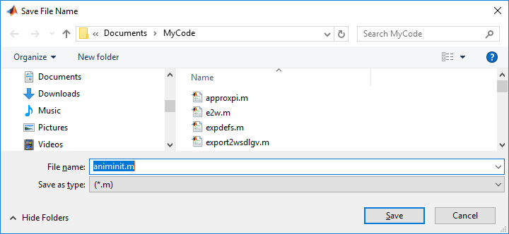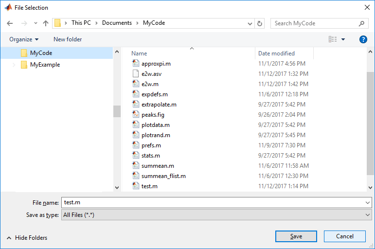 Если пользователь указывает допустимое имя файла и нажимает кнопку Сохранить, MATLAB ® возвращает это имя файла вfile.