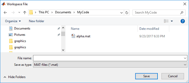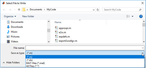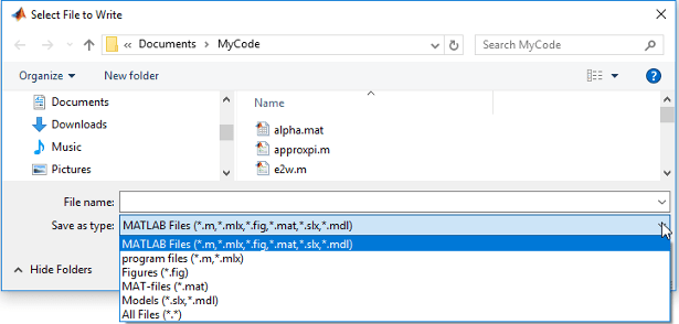 Чтобы записать данные в указанный пользователем файл и расположение с помощью функций панели инструментов MATLAB и MATLAB, используйте путь и имя файла, которые uiputfile возвращает. Например: