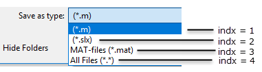 ___ = uiputfile( отображает только те файлы с соответствующими расширениями filter)filter. На некоторых платформах uiputfile также отображает любые файлы, которые не совпадают filter, но они затемнены. uiputfile добавляет Все файлы в список типов файлов.