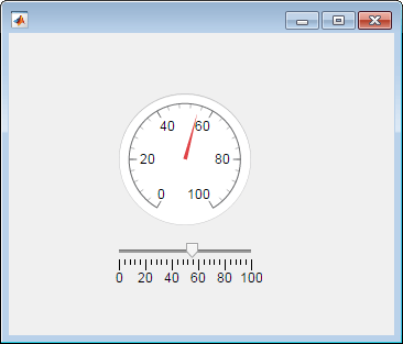 Этот код создает окно, содержащее ползунок и датчик. Когда пользователь приложения перемещает ползунок, ValueChangedFcn обратный вызов обновляет индикатор для отражения значения ползунка.