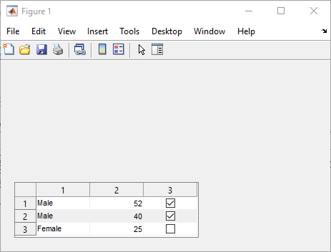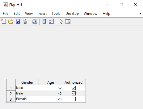 tdata = readtable('patients.xls'); vars = {'Age','Systolic','Diastolic','Smoker'}; tdata = tdata(1:40,vars); fig = uifigure; uit = uitable(fig,'Data',tdata); uit.RowName = 'numbered';