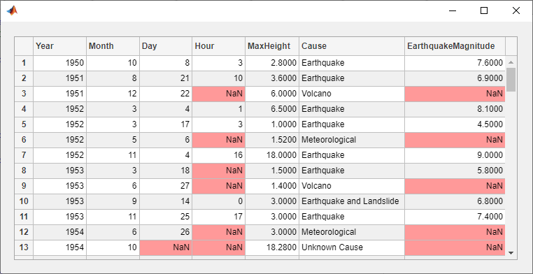tdata = readtable('tsunamis.xlsx'); vars = {'Year','Month','Day','Hour', ... 'MaxHeight','Cause','EarthquakeMagnitude'}; tdata = tdata(1:100,vars); fig = uifigure('Position',[500 500 760 360]); uit = uitable(fig); uit.Position = [20 20 720 320]; uit.Data = tdata; uit.RowName = 'numbered';