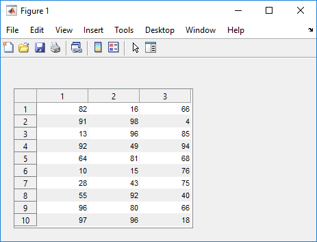 f = figure; uit = uitable(f,'Data',randi(100,10,3),'Position',[20 20 262 204]);