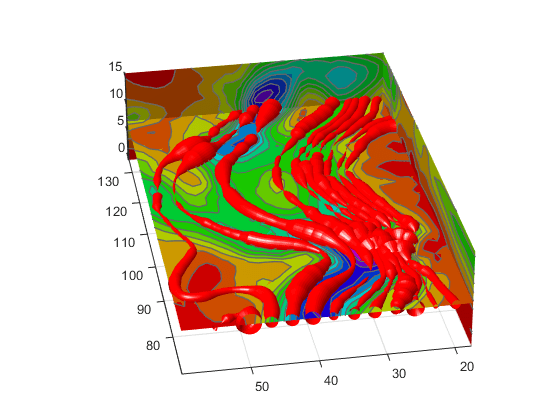 Трубы потока (streamtube) рисуются в указанных местах и масштабируются в 1,25 раза больше ширины по умолчанию, чтобы подчеркнуть изменение дивергенции (ширины). Второй элемент в векторе [1.25 30] указывает количество точек по окружности трубки (по умолчанию 20). Можно увеличить это значение по мере увеличения размера трубки, чтобы сохранить гладкий вид трубки.
