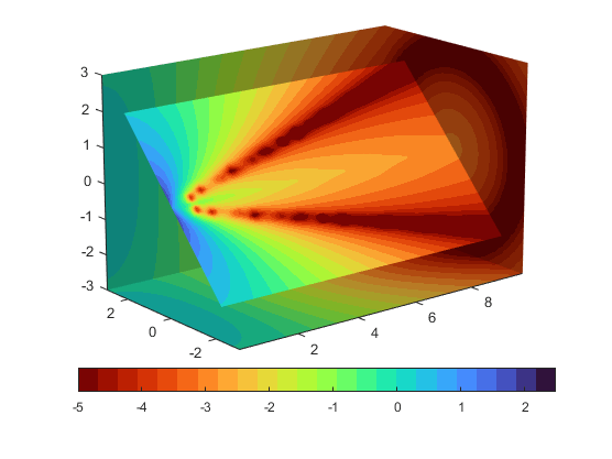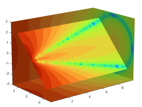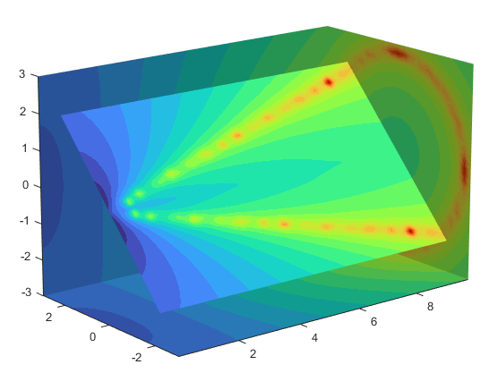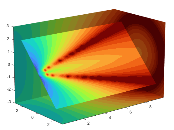 Плоскость среза (которая не обязательно должна быть плоской) - это поверхность, которая принимает раскраску на основе значений данных объема в области, где расположен фрагмент. Плоскости среза полезны для исследования наборов данных тома, чтобы обнаружить, где существуют интересные области, которые затем можно визуализировать с другими типами графиков (см. slice пример). Плоскости среза также полезны для добавления визуального контекста к границе объема при использовании других методов построения графиков (см. coneplot и «Отображение потоков с использованием векторных данных» для примеров).