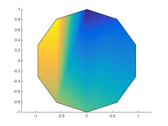 a = t(1:length(t)-1); %remove redundant vertex definition figure patch(sin(a),cos(a),1:length(a),'FaceColor','interp') axis equal