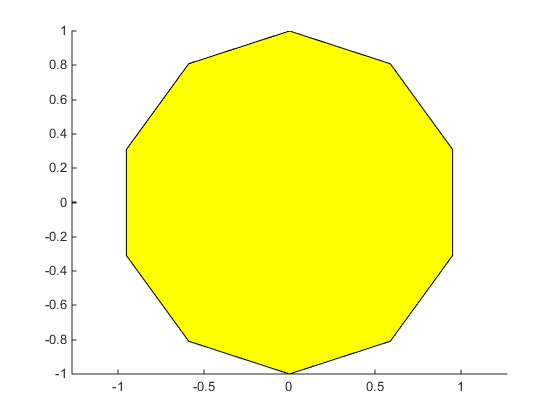 t = 0:pi/5:2*pi; figure patch(sin(t),cos(t),'y') axis equal