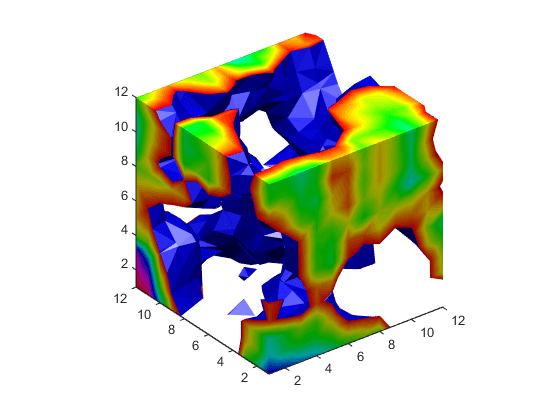 Настройка патча FaceColor свойство для interp приводит к раскраске, которая сопоставляет значения данных, покрываемые изокапой, с записями карты цветов. Можно также задать другие свойства фрагмента для управления влиянием освещения и раскраски на изокапы.
