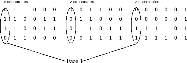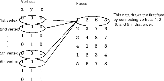 Каждая из шести граней имеет четыре вершины. Поскольку не нужно закрывать каждый многоугольник (т.е. первая и последняя вершины не должны быть одинаковыми), можно определить этот куб с помощью матрицы 4 на 6 для каждой из координат x -, y - и z.