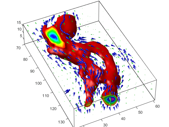 daspect([1 1 1]); [f,verts] = reducepatch(isosurface(x,y,z,wind_speed,30),0.07); h1 = coneplot(x,y,z,u,v,w,verts(:,1),verts(:,2),verts(:,3),3); h1.FaceColor = 'blue'; h1.EdgeColor = 'none';