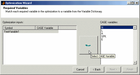 Используйте этот экран, чтобы связать переменные из вашего сеанса CAGE со свободными переменными, которые вы хотите использовать в оптимизации. Выберите правильную пару в правом и левом списках щелчком мыши, затем нажмите большую кнопку, как показано на рисунке.