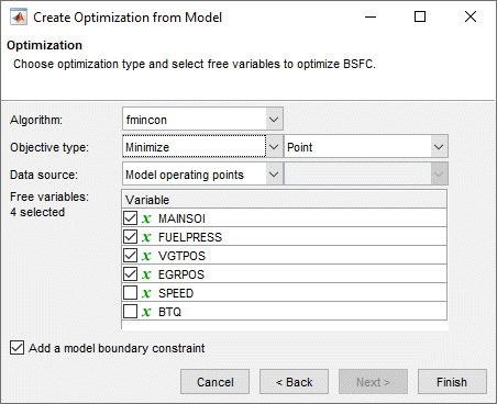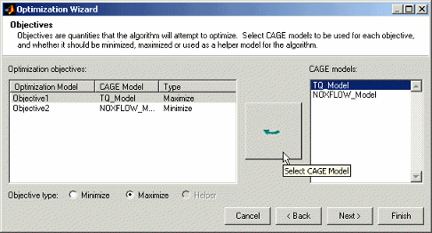 Здесь можно выбрать модели из вашей сессии, которые вы хотите использовать для оптимизации, и хотите ли вы максимизировать или минимизировать выходные данные модели. fmincon алгоритм предназначен для отдельных целей, поэтому можно максимизировать или минимизировать только одну модель. NBI или gamultiobj алгоритмы могут оценивать несколько целей. Например, может потребоваться максимизация крутящего момента при минимизации выбросов NOx. Следует помнить, что позже можно определить ограничения, например, используя требования к выбросам.