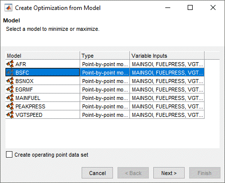 При наличии двухточечных моделей, как показано в этом примере, можно дополнительно установить флажок Создать набор данных рабочих точек (Create operating point data set).