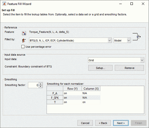 CAGE оценивает модель по указанному количеству точек сетки, затем вычисляет суммарную квадратную ошибку между этой моделью сетки и значениями элемента. Если зависимости градиента отсутствуют, CAGE использует lsqnonlin для корректировки значений таблицы до минимизации ошибки. При наличии ограничений градиента для указания градиента таблицы в каждой ячейке CAGE использует fmincon.