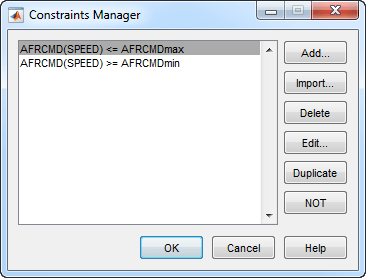Необходимо подогнать граничную модель к данным, собранным в точках проектирования воздушной съемки. Данные испытаний, полученные в ходе обследования воздуха, использовались для создания граничной модели рабочего диапазона двигателя. Пример файла проекта браузера модели CI_MultiInject_AirSurvey.mat содержит эту граничную модель.