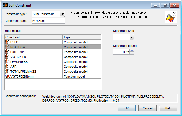 Выберите Sum_BSFC_NOX для просмотра настройки оптимизации суммы. Оптимизация суммы была создана на основе результатов оптимизации точек. Соблюдайте 2 цели и все ограничения.