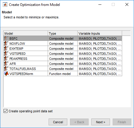 Выберите модель BSFC и установите флажок Создать набор данных рабочих точек (Create operating point data set) и нажмите кнопку Далее (Next).