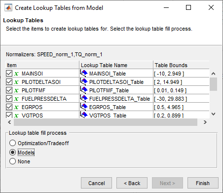 Чтобы увидеть, как настроить таблицы для заполнения результатами оптимизации, выберите Инструменты > Создать таблицы подстановки из модели. Откроется мастер Создать таблицы подстановки из модели (Create Lookup Tables from Model).