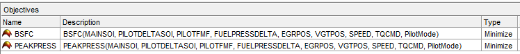 Просмотрите две цели на панели «Цели». Они настроены на минимизацию BSFC и PEAKPRESS. Дважды щелкните цель, чтобы просмотреть ее параметры.