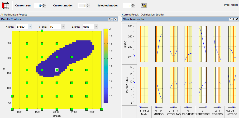 Вы хотите, чтобы оптимизация определила, какой пилотный режим (активный пилотный впрыск или отсутствие пилотного впрыска) лучше всего использовать в каждой рабочей точке. Для этого необходимо выбрать Modal optimization из списка «Алгоритм».