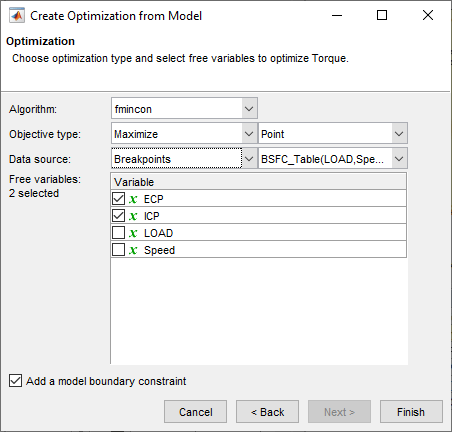 Обратите внимание, что параметры по умолчанию создают оптимизацию точек для минимизации Torque, используя 4 свободные переменные и ограничиваясь граничной зависимостью модели. Чтобы создать этот пример оптимизации, измените параметры, чтобы максимизировать Torque, использовать точки останова таблицы BSFC в качестве источника данных и использовать только ECP и ICP в качестве свободных переменных. Нажмите кнопку Готово (Finish), чтобы создать оптимизацию.