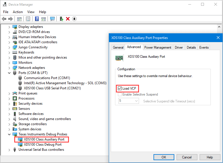 Щелкните правой кнопкой мыши по XDS100 Class Debug Port Properties и выберите Свойства. Перейдите на вкладку «Дополнительно» и снимите флажок «Загрузить VCP».