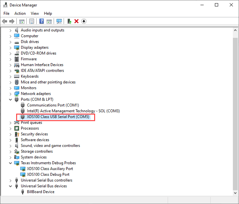 Отсоедините и снова подключите кабель USB к системе и просмотрите обновления в диспетчере устройств, чтобы определить COM-порт. Теперь система отображает COM-порт, принадлежащий аппаратной плате контроллера C2000 подключенного TI.