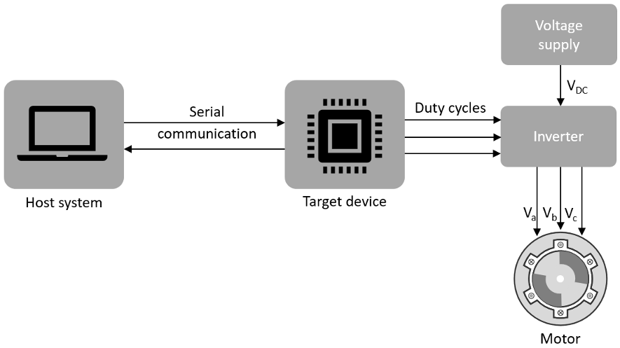В примерах модельных блоков Motor Control Blockset используется алгоритм быстрого последовательного мониторинга данных, который выполняет операции управления и диагностики через модель хоста. Этот алгоритм позволяет наблюдать данные от целевого устройства с той же скоростью, что и время выборки выполнения (например, частота ШИМ 20 кГц). Это, в свою очередь, помогает в диагностике и анализе переходных процессов.
