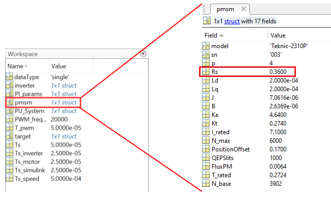 Используйте рабочую область для редактирования значений управляющих переменных. Например, для обновления сопротивления статора (Rs), используйте переменную pmsm для добавления значения параметра к Rs поле.