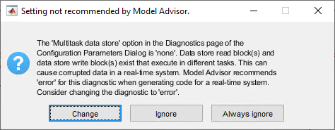 Игнорировать предупреждающее сообщение Multitask data store option in the Diagnostics page of the Configuration Parameter Dialog is none отображается консультантом по модели путем нажатия кнопки Всегда игнорировать (Always Ignore). Это часть предполагаемого рабочего процесса.