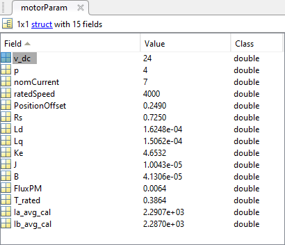 Для просмотра сохраненных параметров загрузите MAT (.mat) в рабочей области MATLAB ®. MATLAB сохраняет параметры в структуре с именемmotorParam в рабочей области.